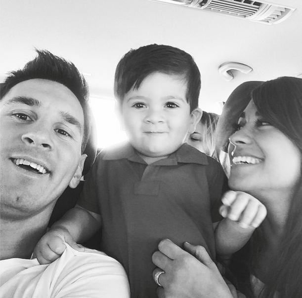 Antes de bajar del avión, Leo aprovechó y se tomó una selfie que publicó en su cuenta de Facebook junto a Antonella, su mujer, y Thiago, su pequeño hijo.
