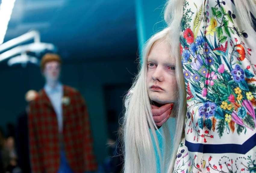 La firma Gucci irrumpió en la Semana de la Moda de Milán con un provocador desfile en el que sus modelos llevaban en la mano recreaciones de sus propias cabezas "decapitadas".