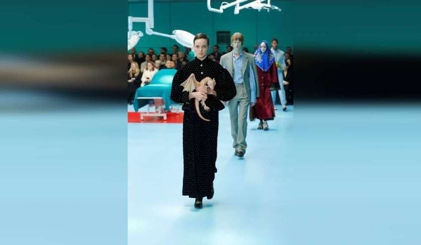 Pasamontañas, velos de encaje y joyas sirvieron para ocultar los rostros de varios modelos y muchos de ellos desfilaron con dragones falsos y cachorros de serpientes.