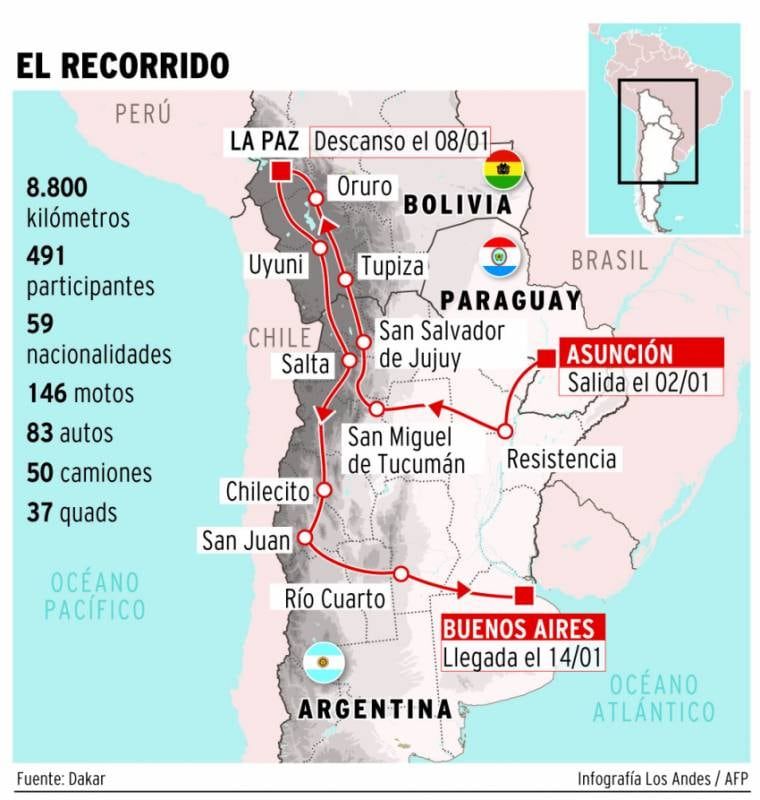 Se recomienda a los pilotos resistencia extrema. El Rally Dakar, que atravesará tres países sudamericanos, pasará seis días a más de 3.000 metros de altura además de rozar Uyuni, en Bolivia, el mayor desierto de sal del planeta.
