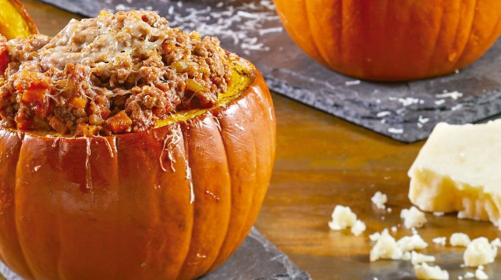 4. Rellená las calabazas con la salsa boloñesa y espolvoreá el queso parmesano. Horneá las calabazas otra vez a 200 ºC por 10 minutos o hasta que el queso se dore y gratine.