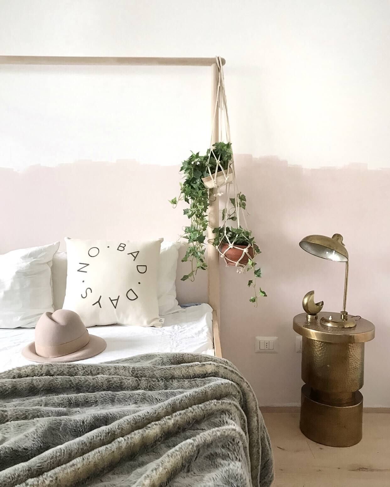 La cama Gjöra de Ikea y la pared a medio pintar en rosa con ese efecto “inacabado” enamoran.