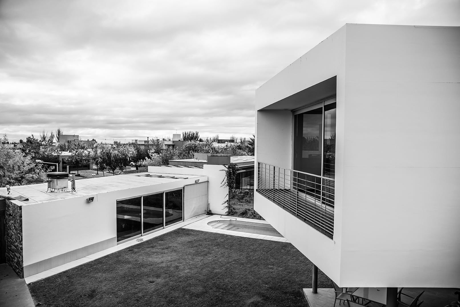 En el sector del terreno que se comunica con la zona pública se ubica un SUM. Su materialidad y forma se diferencia de la casa lo que deja prevalecer el impulso gestual de la geometría buscando dónde orientar las visuales de sus habitantes.