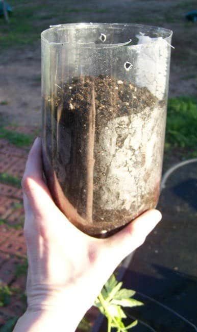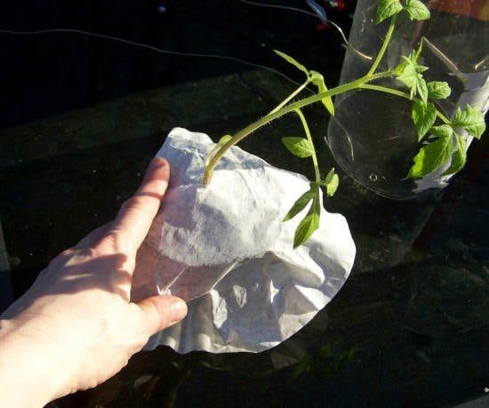 Colocá la planta en la botella. A través de un agujero pasa la planta por el centro del filtro de café. Envolvelo suavemente alrededor de la base que cubre la tierra.
