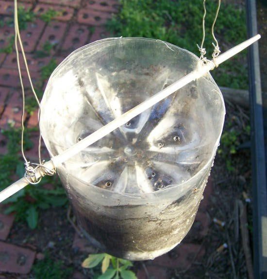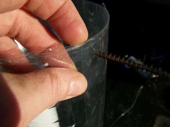 Sujeción de la botella. Hacé dos agujeros en los laterales para insertar un palillo. Asegurate de que los agujeros estén en la misma posición para cuando quede en equilibrio.