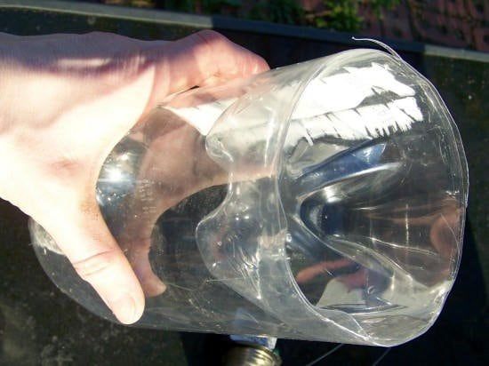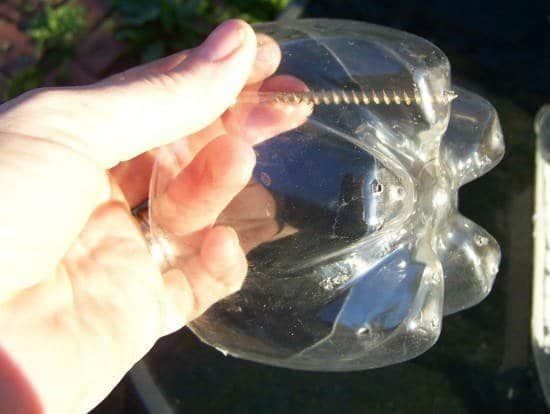 Perforá la parte inferior de la botella. Realizaremos de 10 a 15 agujeros para que la propia botella actúe como regadera. Así quedará el dispensador de agua.