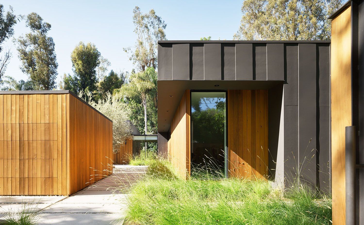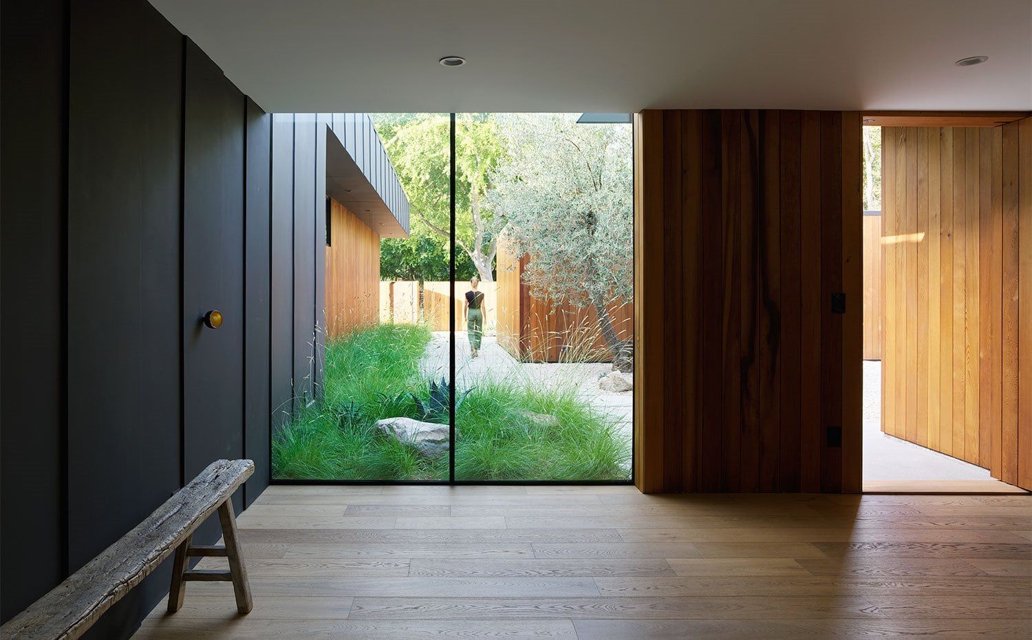 Cerramientos de cristal de grandes dimensiones perforan los muros revestidos de madera para crear vistas a través de los interiores hacia el exterior. Esto incluye puertas de bolsillo que están diseñadas para abrir la pared por completo.