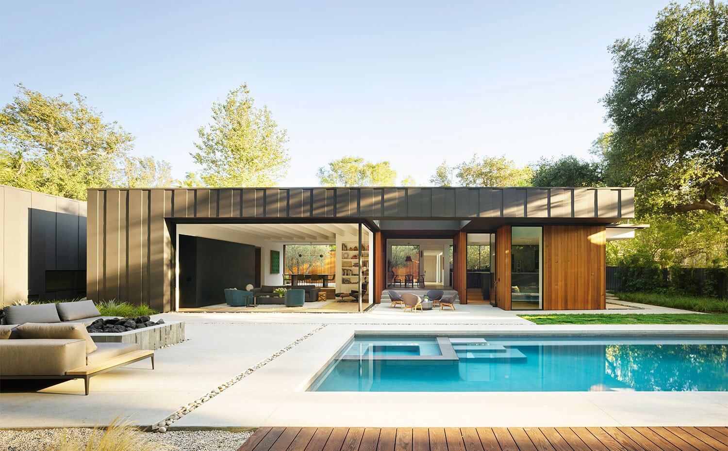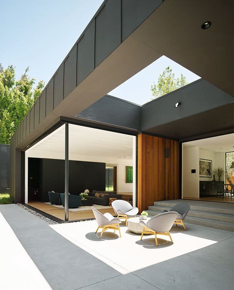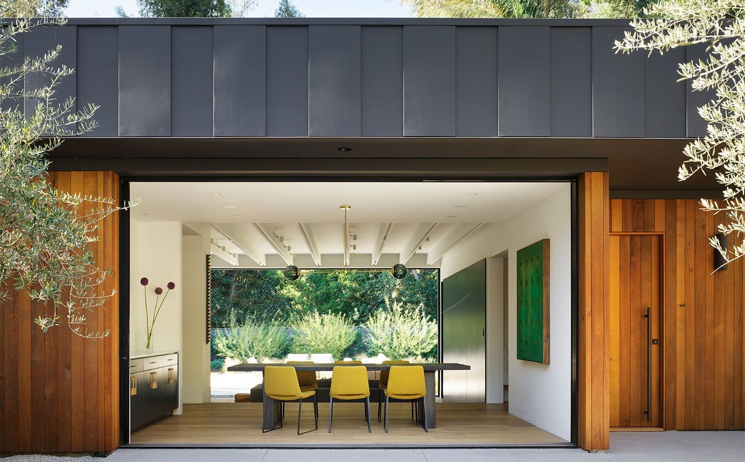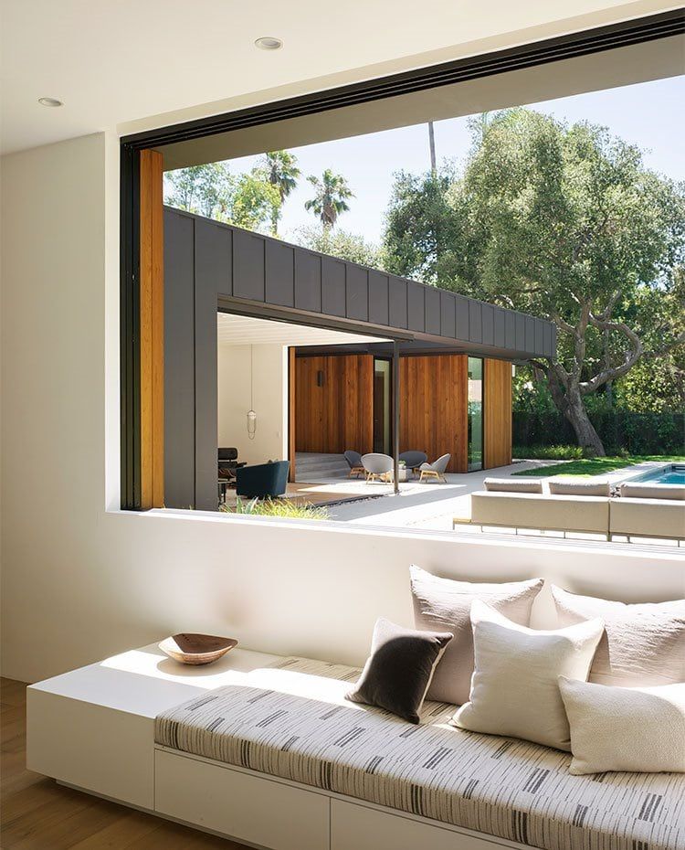 Grandes aperturas con cerramientos acristalados perforan los muros revestidos de madera para crear vistas a través de los interiores hacia el exterior, y viceversa. Esto incluye puertas con sistema corredizo oculto, diseñadas para abrir las paredes por completo.