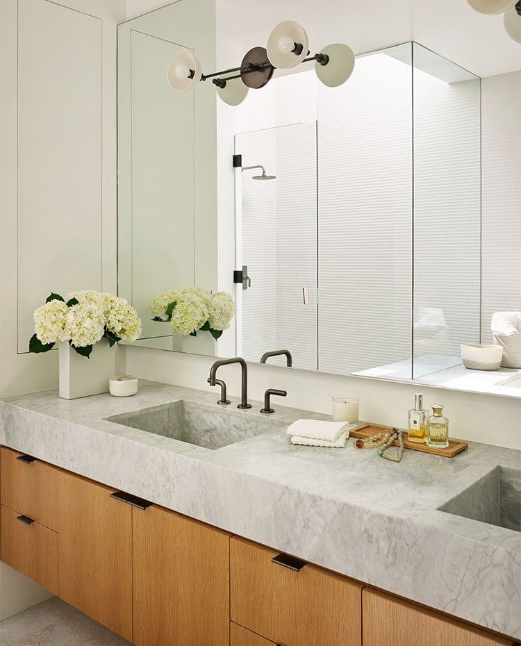 El cuarto de baño principal está equipado con mueble de lavabo suspendido en acabado madera natural. El revestimiento de la pared pertenece a la colección Old White, de Porcelanosa. Junto a un amplio espejo de pared, las luminarias a modo de aplique son el modelo Trapeze, de Apparatus Studio.