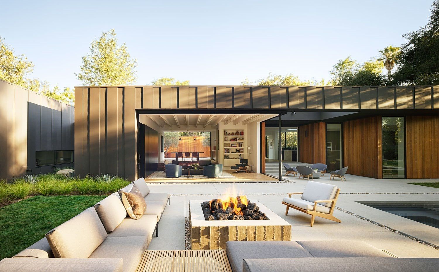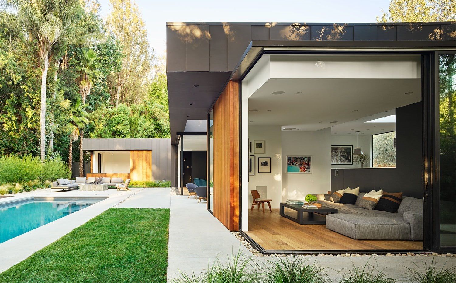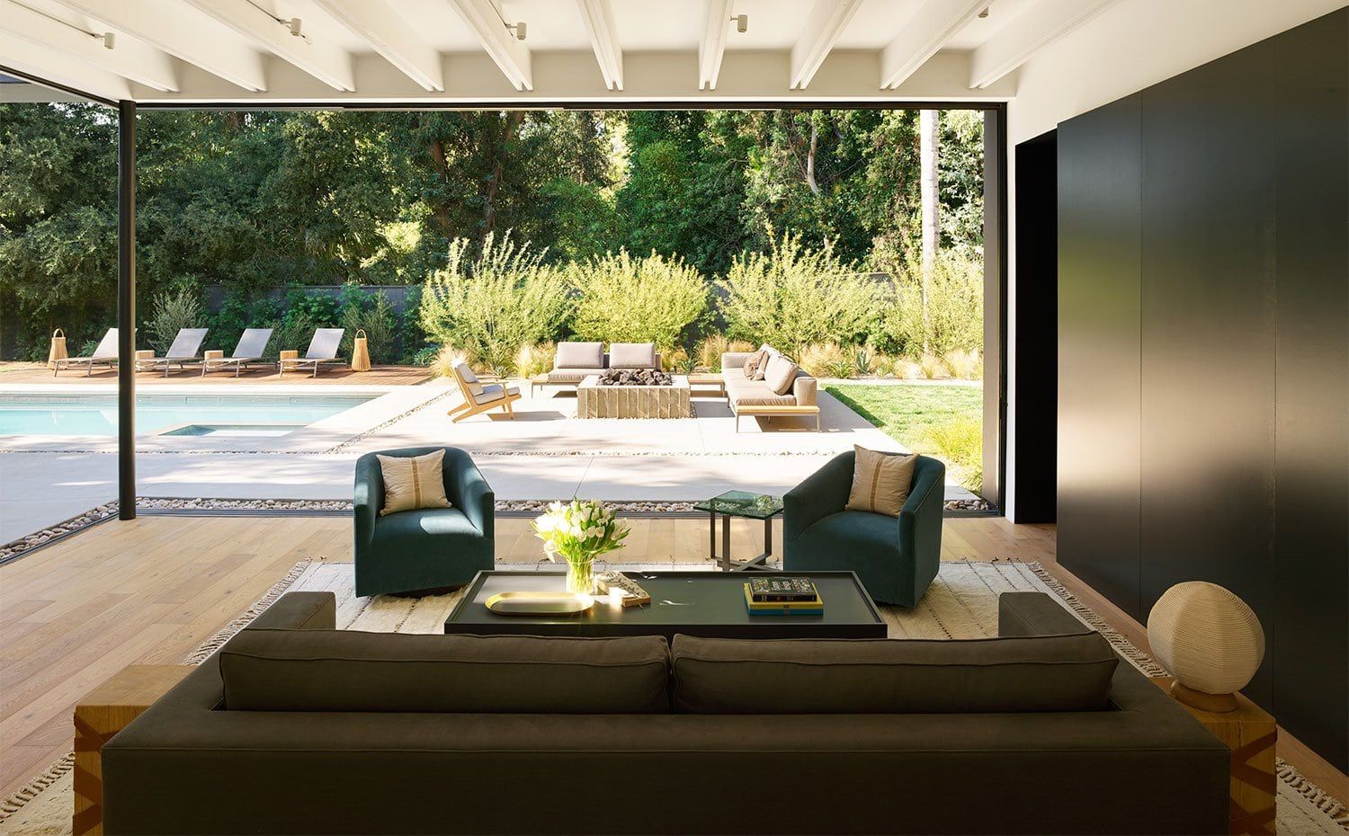 El salón ha optado por abrirse más allá de sus límites a través de puertas de vidrio corredizas que se abren a la piscina y al patio. El sofá y las butacas de interior son de la firma RH Modern, mientras que el mobiliario exterior es de la firmas Gloster.