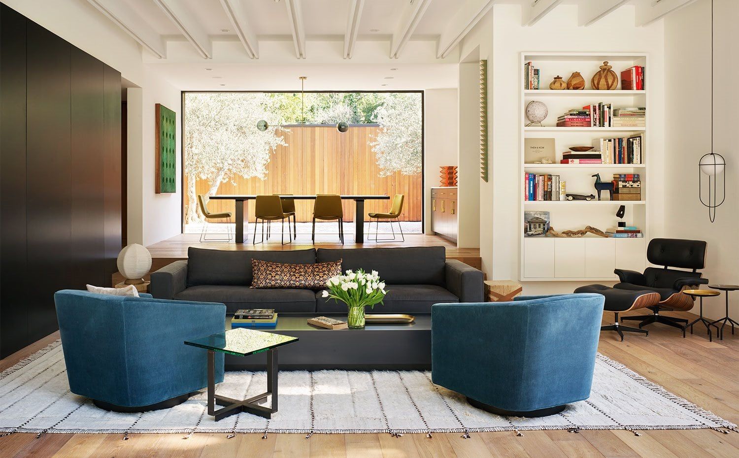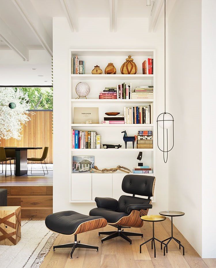 El rincón de lectura de salón está presidido por el ícono sillón Eames Lounge Chair y su reposapiés Ottoman, diseñados por Charles & Ray Eames en 1956. Una librería en blanco y un mobiliario auxiliar de aspecto ligero lo acompañan cediéndole todo el protagonismo.