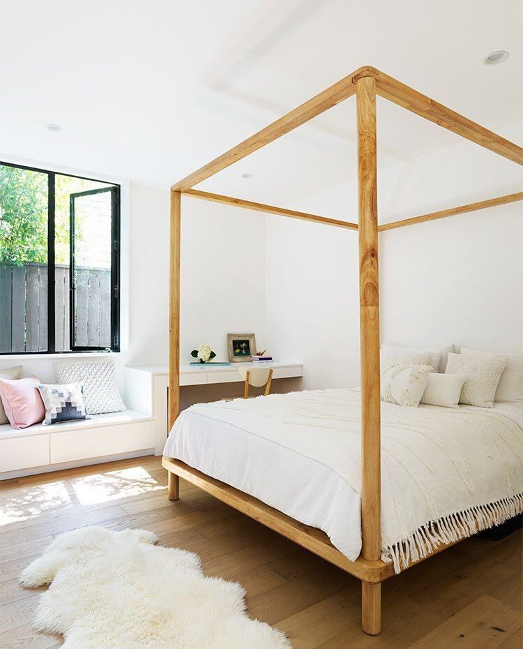 El dormitorio infantil está equipado con una cama con dosel en madera, acabado natural, a juego con el suelo. El equipamiento de la estancia se completa con un rincón de estudio y una bancada, dispuestos junto a la pared, en blanco para una mayor integración.