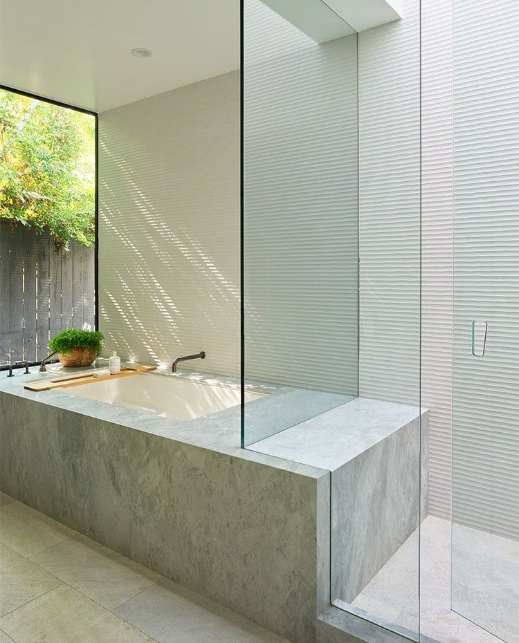 La bañera integrada y revestida de mármol gris se dispone junto a la ducha de obra, ambas separadas por un paramento de cristal transparente que aporta funcionalidad sin escatimar un ápice de luz natural a la vez que se mantiene la visión conjunta del espacio.