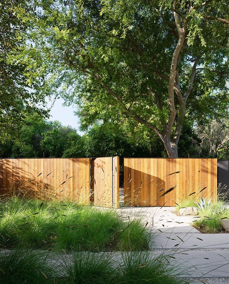 Proyectada en la localidad de Los Ángeles se oculta tras una vaya a modo de listones que delimitan la parcela e integra la puerta de acceso a la finca.