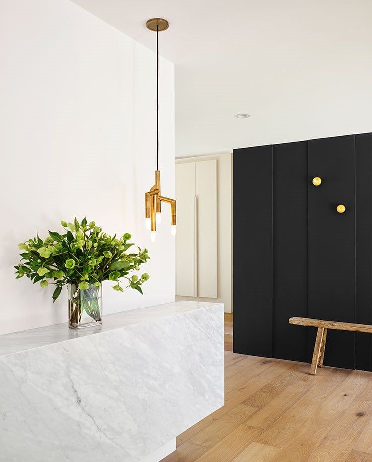 El vestíbulo de entrada está equipado con una consola de mármol suspendida, de Modul Marble. La luminaria colgante con estructura de bronce es un diseño de Jonathan Browning, disponible en Thomas Lavin. Junto al frente de armarios acabado en negro, destaca un banco antiguo, adquirido en Big Daddy's Antiques.