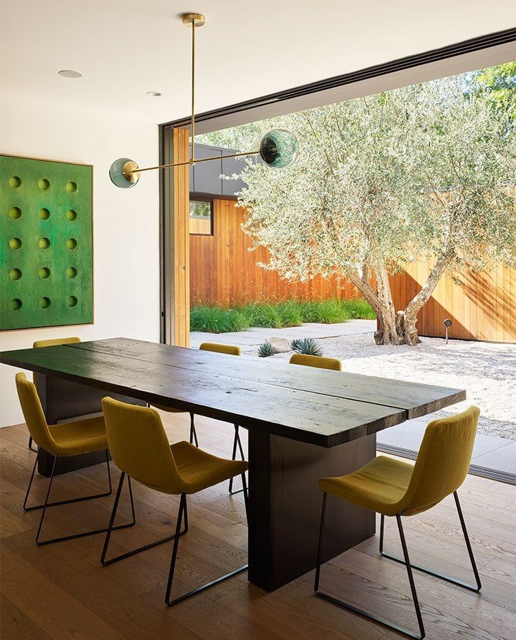 El comedor, abierto hacia el exterior como si de un escenario se tratara, está equipado con luminaria suspendida de latón, de Douglas and Bec. Las sillas son el modelo Metropolitan de B&BItalia. La mesa está hecha a medida por Reeve Schley. La pintura en verde es obra de Bradley Duncan.