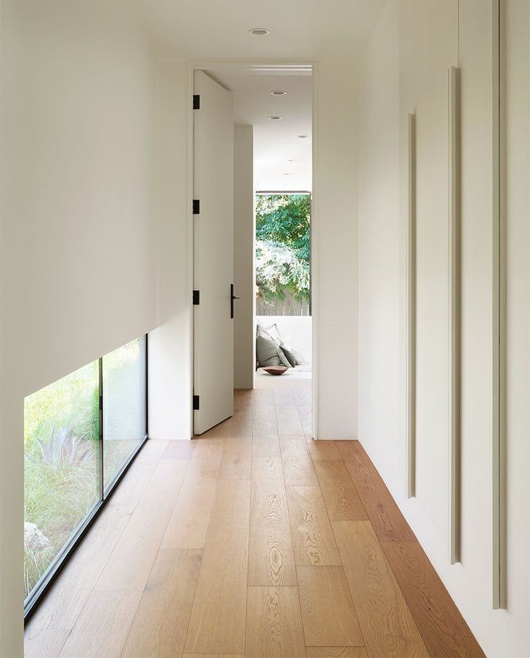 Paredes y techos pintados de blanco, y suelos de madera pálida corren por todo el interior de la residencia de 455 m2 de superficie, en cuyas zonas de paso se ha aprovechado para habilitar armarios integrados de gran capacidad de almacenaje.