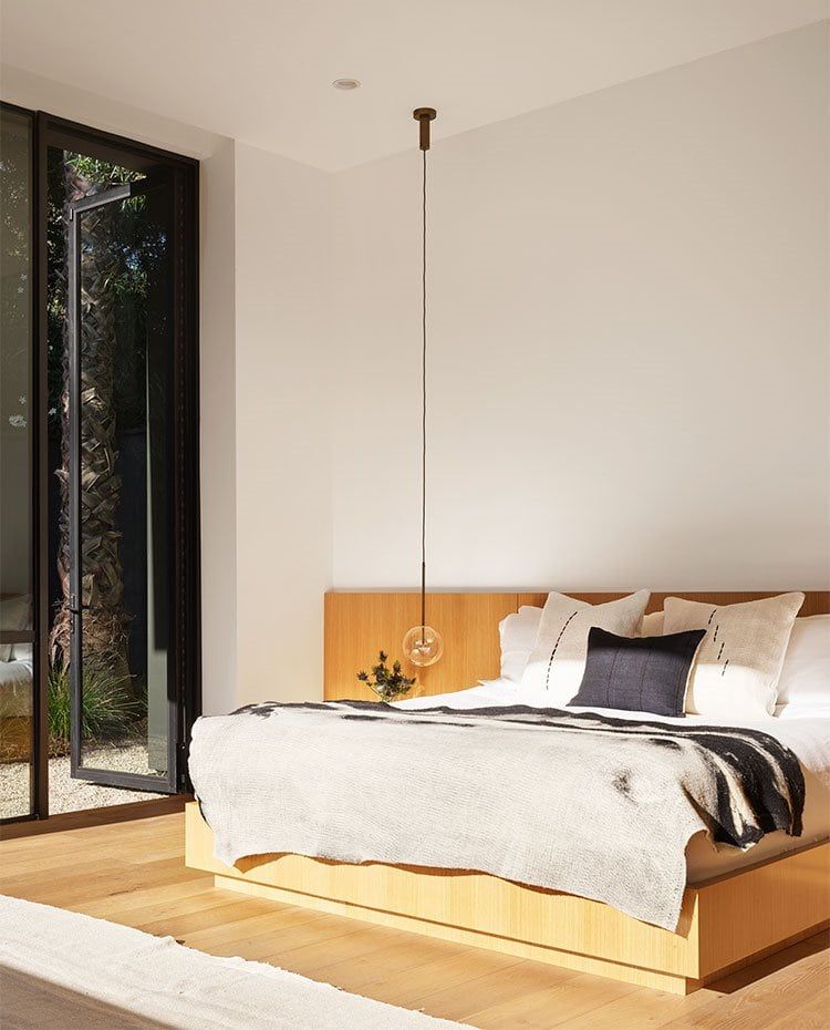El dormitorio principal, envuelto de paramentos blancos, está equipado con mobiliario en madera natural. La cama es de JG Switzer y las almohadas decorativas de Dacha Home. La alfombra es de la firma Mehraben y la luminaria suspendida es el modelo Bolle Sola, diseñada por Massimo Castagna, de Gallotti & Radice.