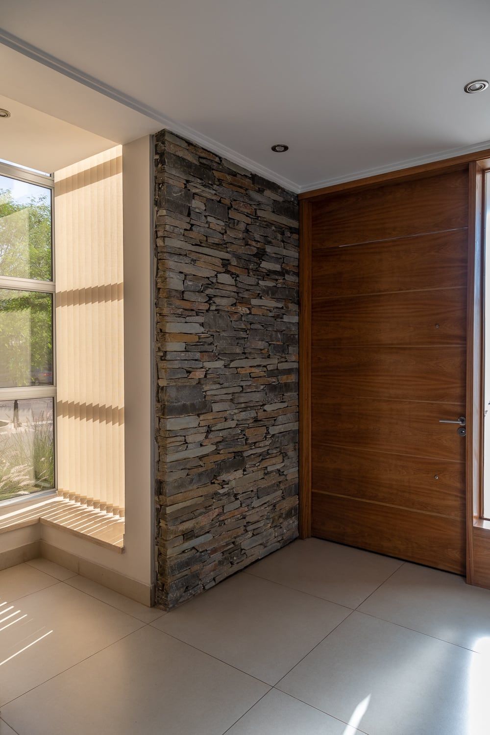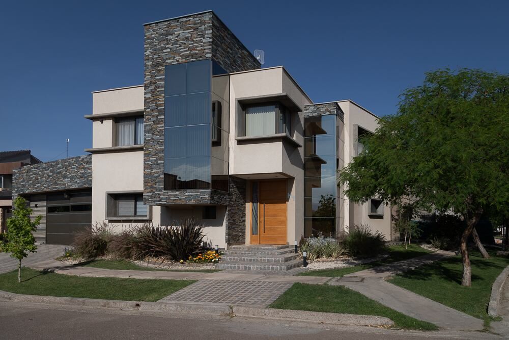 La luz solar y los ambientes con ventilación natural fueron objetivos claros desde los primeros trazos del anteproyecto. El desafío fue contar con un amplio programa de necesidades en un terreno que, por ser en esquina, se percibía afectado por retiros en todos sus lados. Ante todas estas premisas, la casa tiene su huella en forma de “L”, buscando desde su fachada acompañar la esquina delimitada por el terreno, con volúmenes más cerrados hacia el sur y dos pieles de vidrio en esquina, de doble altura que traen las vistas de la cordillera al interior de los espacios comunes, tales como el hall de entrada y la escalera. Lugares desde los cuales se pierde el límite entre el adentro y el afuera.