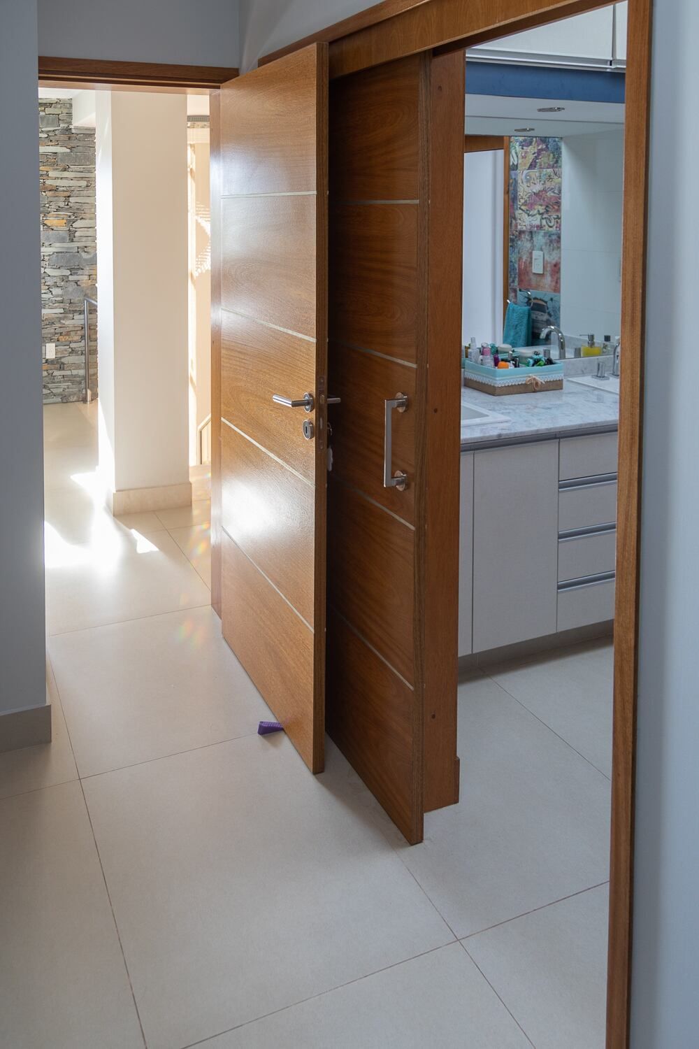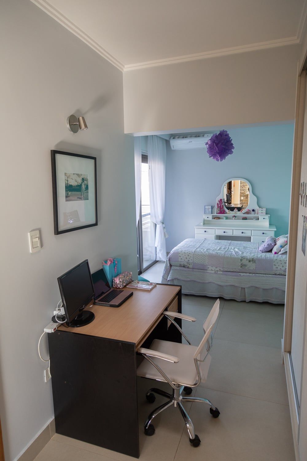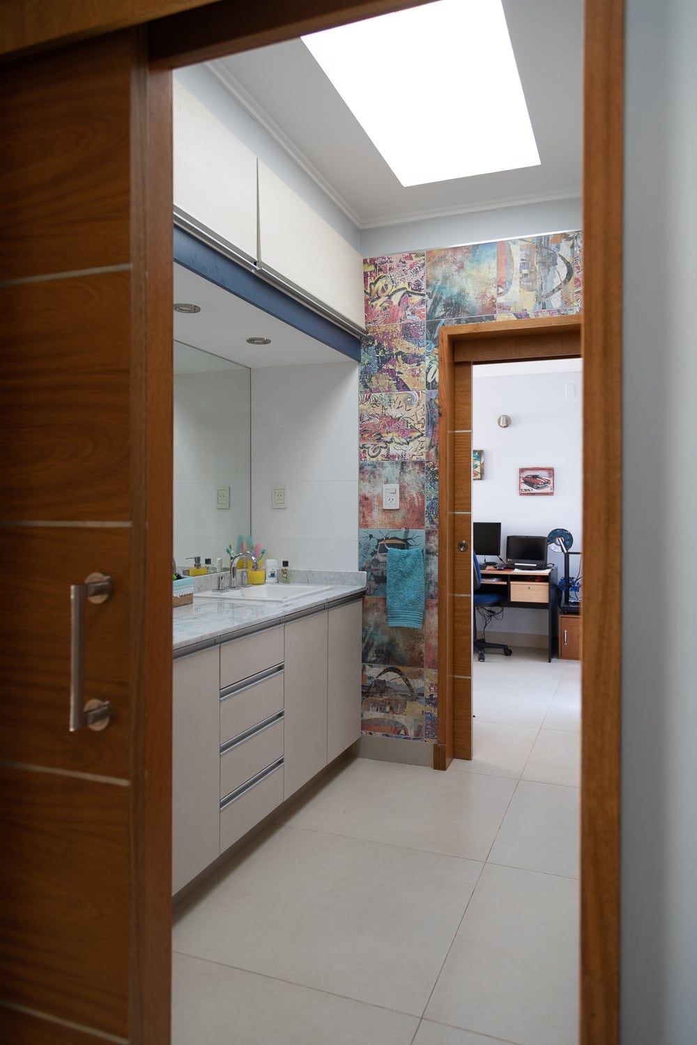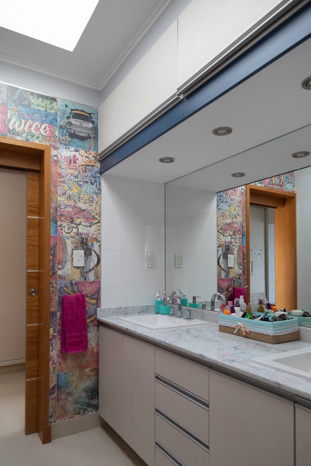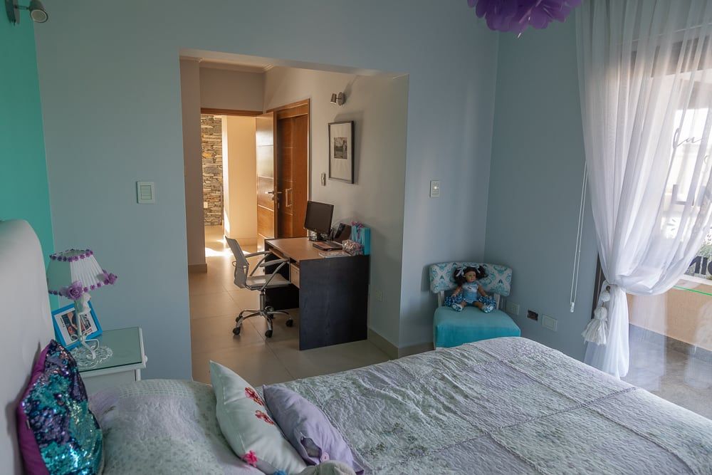Los dormitorios de los hijos comparten una entrada privada que conecta a ambos espacios con el gran antebaño compartido, que sirve a su vez de antesala al baño zonificado. De esta manera un solo núcleo húmedo puede ser totalmente funcional a los dos adolescentes.