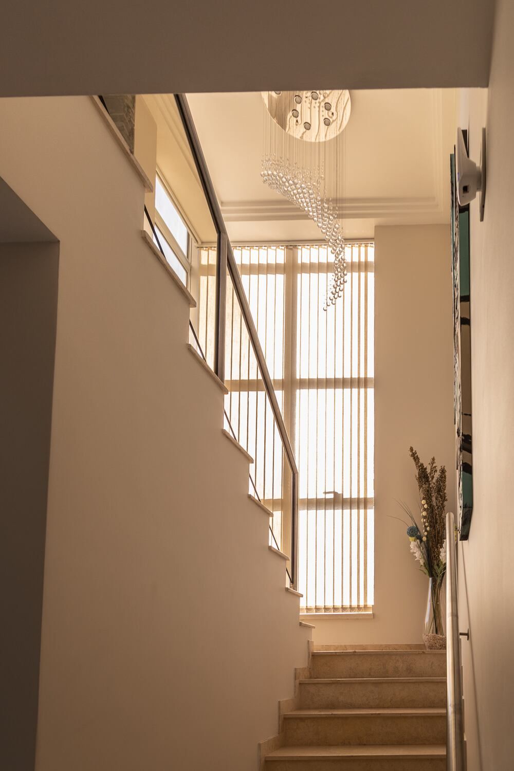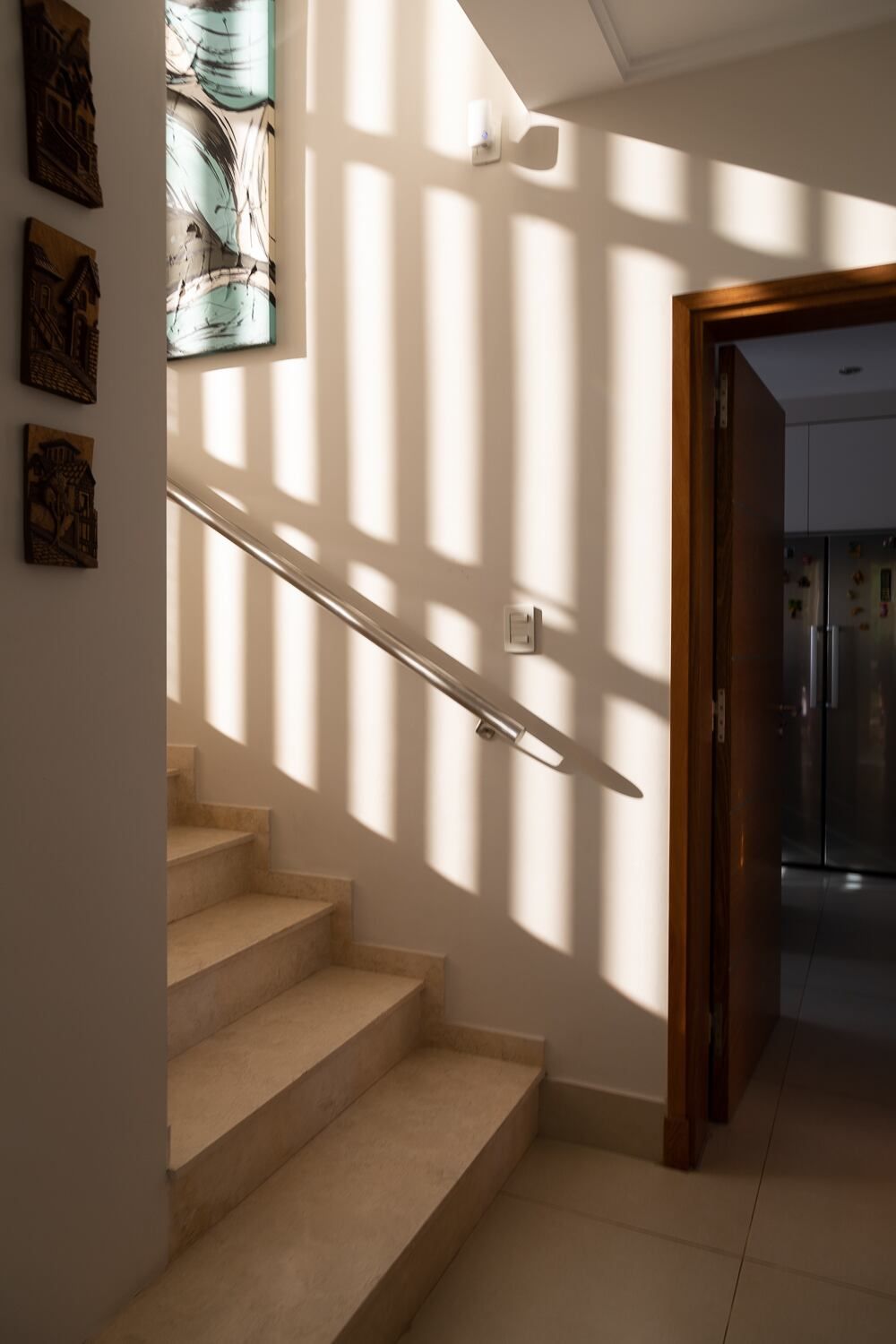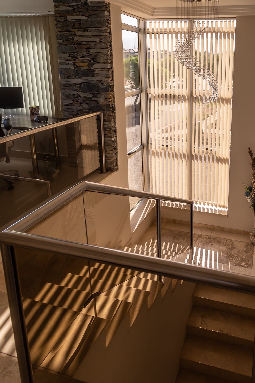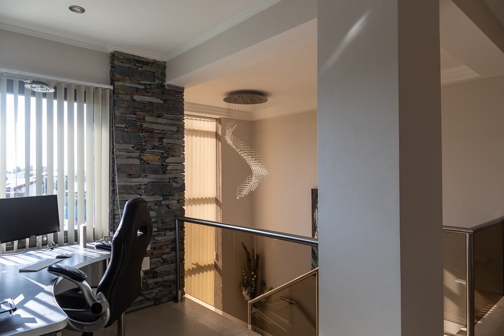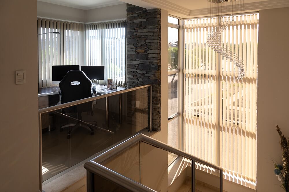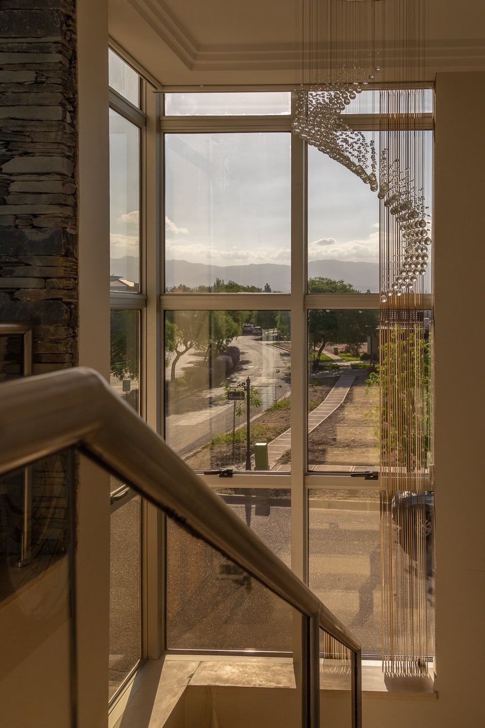 Subiendo por la escalera, y gracias a la piel de vidrio en esquina, se disfruta de vistas limpias hacia la cordillera que invaden todo el hall de planta alta y el playroom que se amoldó a un cómodo espacio de home office, en respuesta a la nueva modalidad de trabajo que se impuso con la pandemia que estamos atravesando.