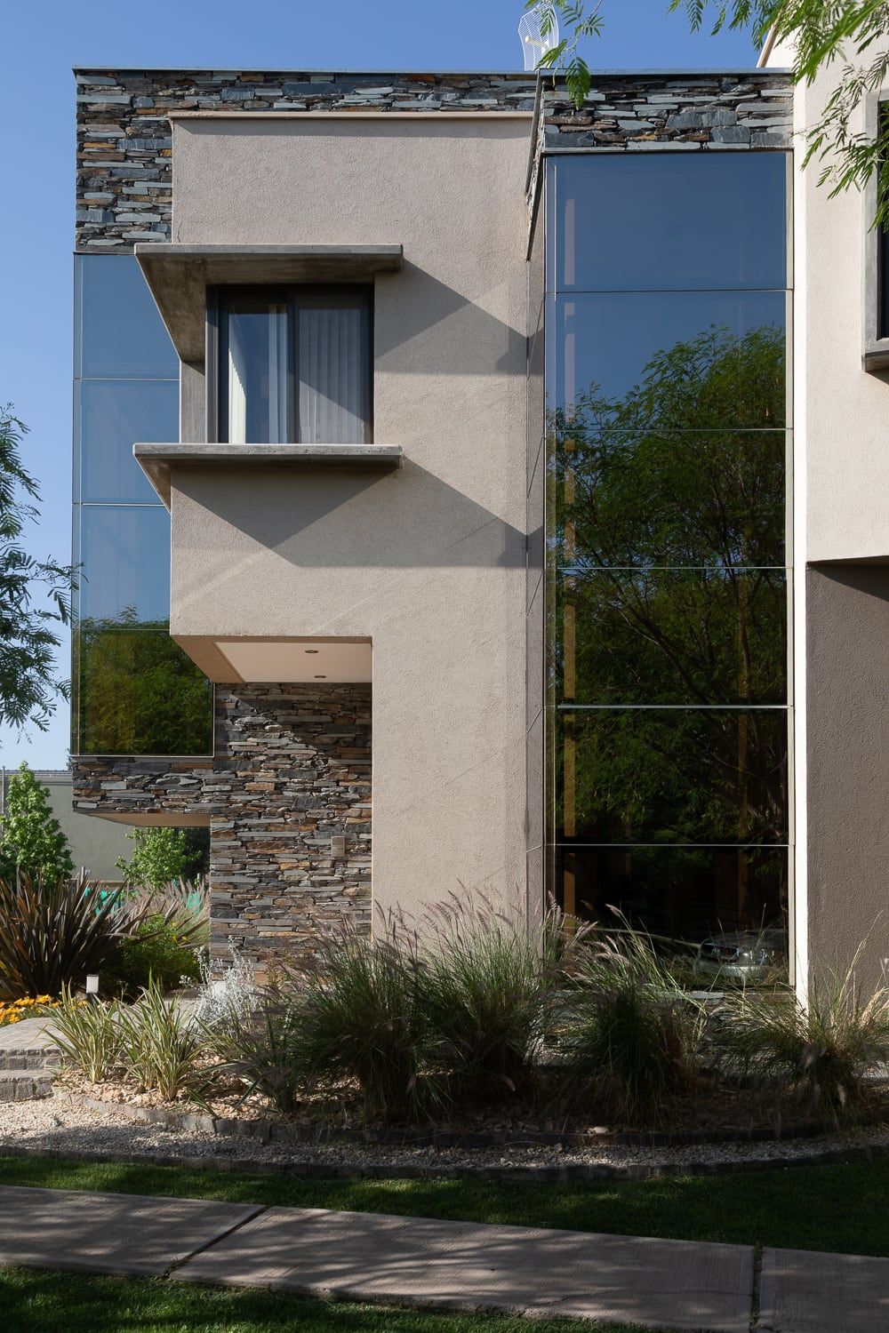 La esencia del proyecto paisajístico de la fachada exterior, consistió en generar canteros curvos que aporten movimiento y contengan una combinación de especies variadas en colores y texturas. Los dibujos de piedra a nivel de piso generan cortes visualmente agradables, que facilitan el mantenimiento diario y reducen la superficie de riego con el objetivo de consumir la menor cantidad de agua posible.