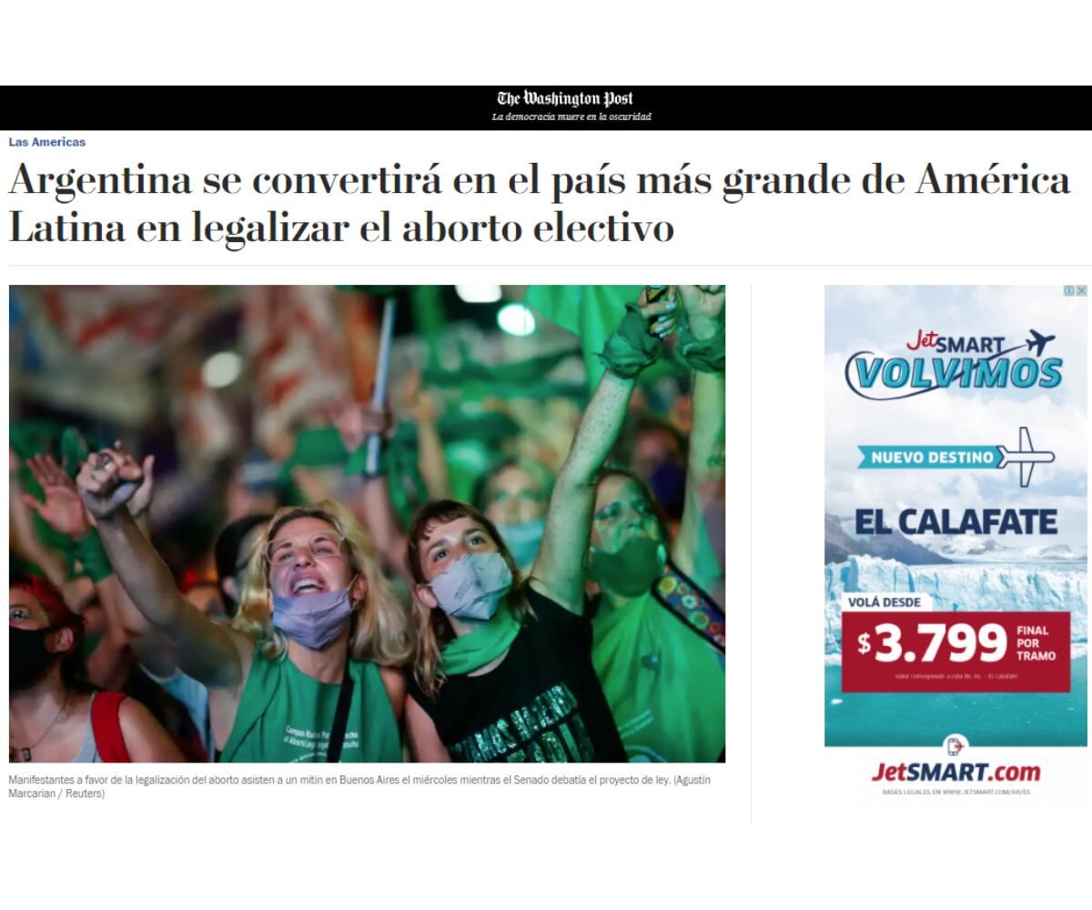 “Argentina se convertirá en el país más grande de América Latina en legalizar el aborto electivo”, relató el periódico estadounidense Washington Post en una crónica en la que destacó que es uno de los pocos países sudamericanos donde el aborto es legal.