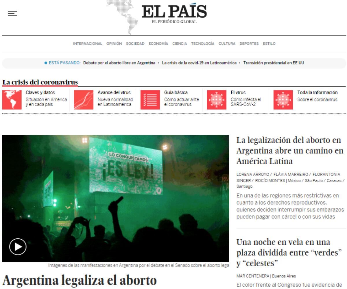”La legalización del aborto en Argentina abre un camino en América Latina”, afirmó el diario español El País. ”En una de las regiones más restrictivas en cuanto a los derechos reproductivos, quienes deciden interrumpir sus embarazos pueden pagar con cárcel o con sus vidas”, agregó.
