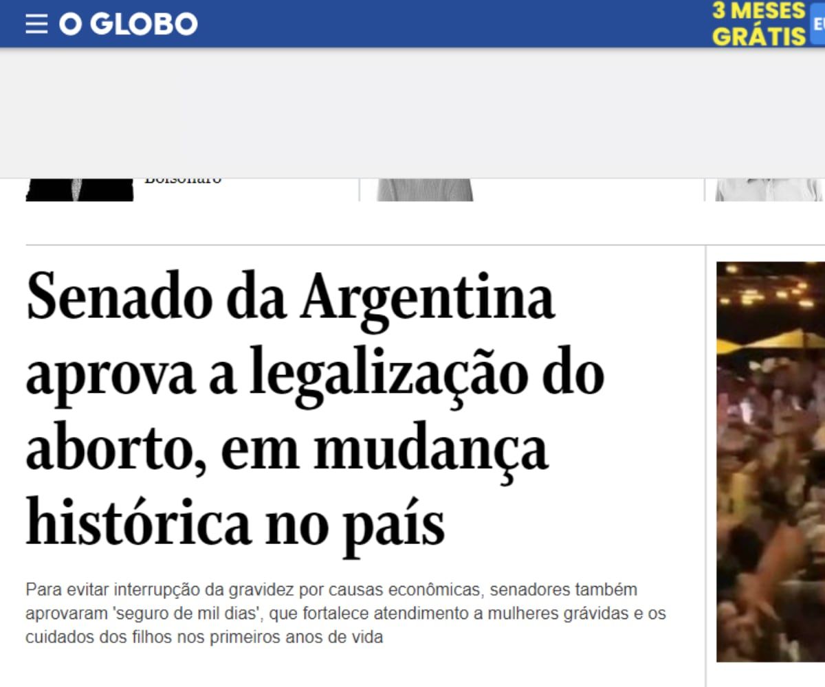 ”Senado argentino aprueba legalización del aborto, en cambio histórico en el país”, tituló por su parte el diario brasileño O Globo. El periódico agregó que para evitar la interrupción del embarazo por motivos económicos, los senadores también aprobaron el ‘seguro de mil días’, que fortalece la atención a la gestante y el cuidado de los niños en los primeros años de vida.