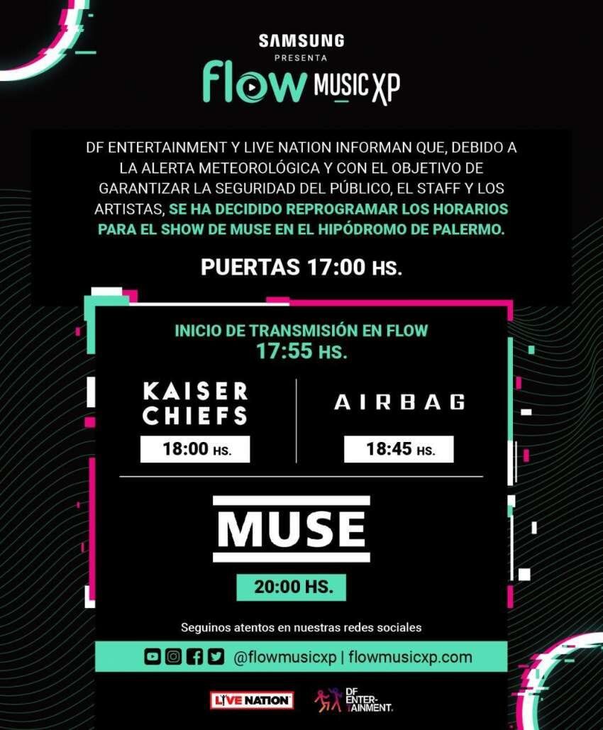 Muse inaugurará la primera temporada de shows de Flow Music XP, que incluyen a más de 20 artistas internacionales de primer nivel. A esta banda inglesa, la continuará la artista LP, el 15 y 16 de octubre en Teatro Vorterix; Tove Lo, el 19 de noviembre en Teatro Vorterix; Backstreet Boys, el 7 de marzo en el Campo Argentino de Polo; el festival Lollapalooza Argentina, el 27, 28 y 29 de marzo en el Hipódromo de San Isidro; Metallica, el 18 de abril de 2020; y Kiss, el 9 de mayo de 2020.