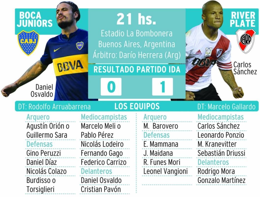 En River no estará Gutiérrez, expulsado en la ida y además desgarrado, y en su lugar ingresará el mendocino Martínez. Se presume que el Millo apostará a esperar agazapado para salir de contra, con la certeza de que si marca un gol la eliminatoria quedará casi resuelta en su favor. El último de los clásicos oficiales del primer semestre se presume parejo, como los anteriores, con las urgencias del lado de Boca, ya que si queda afuera en La Bombonera ante su clásico rival, Arruabarrena cargará con una mochila pesada durante el resto de su ciclo. River tiene la mesa servida, pero no debe confiarse ni podrá apelar al juego brusco, con un árbitro que hará su debut internacional como Herrera, quien llega con buenos antecedentes y un futuro que quedará marcado según como dirija hoy.
