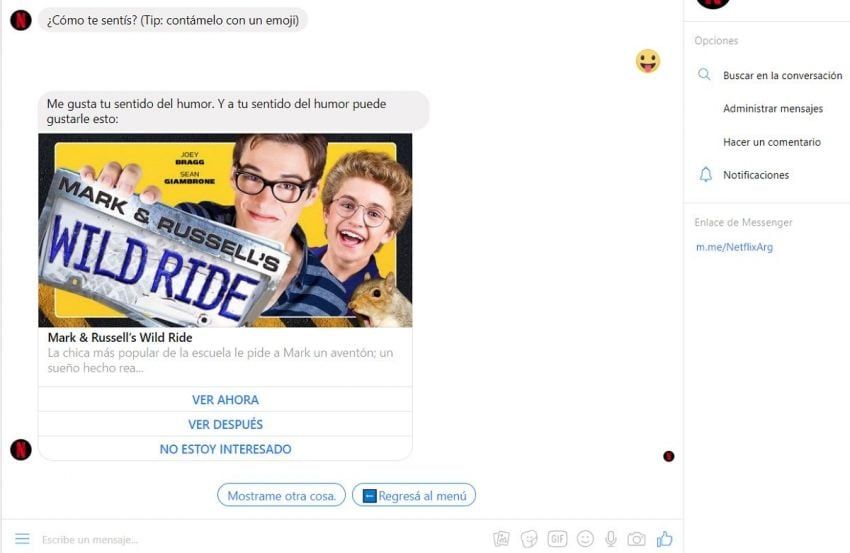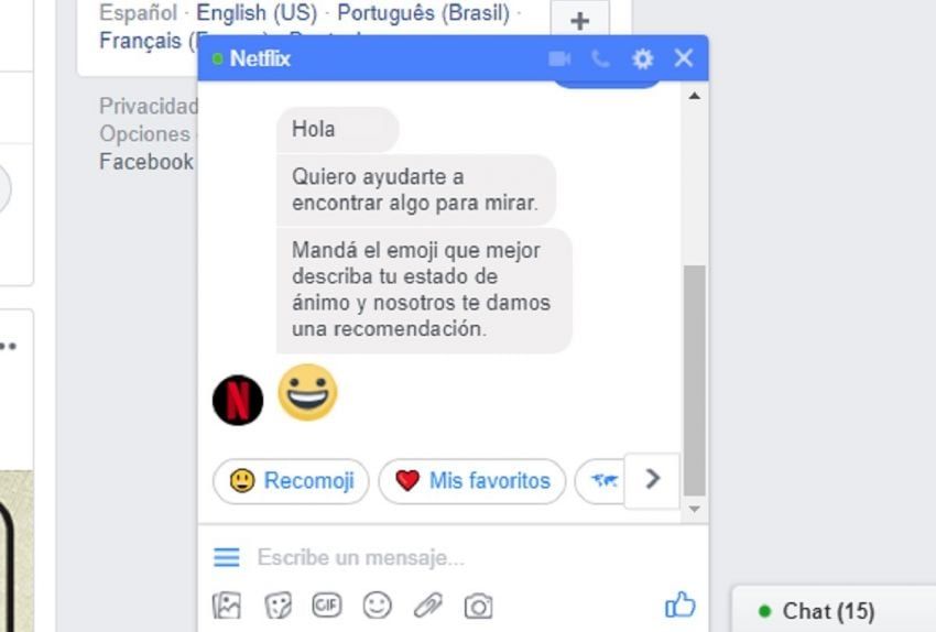 Para utilizar esta simpática función, los usuarios deben ingresar al perfil oficial de Netflix en Facebook. Luego envían un mensaje privado con un emoji y se recibirá una respuesta acorde al estado de ánimo. En caso de no agradar la recomendación -o si ya la viste-, podés contestarle al bot y seguirá enviándote otras propuestas.