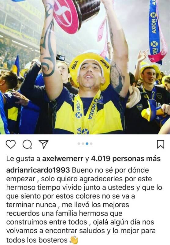 "Bueno no sé por dónde empezar, solo quiero agradecerles por este hermoso tiempo vivido junto a usted y que lo que siento por estos colores no se va a terminar nunca, me llevo los mejores recuerdos, una familia hermosa que construimos entre todos, ojalá algún día nos volvamos a encontrar, saludos y lo mejor para todos los bosteros", escribió Ricky, que debe volver al San Pablo de Brasil, club dueño de su pase.