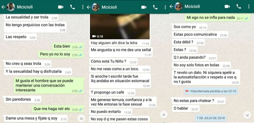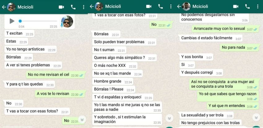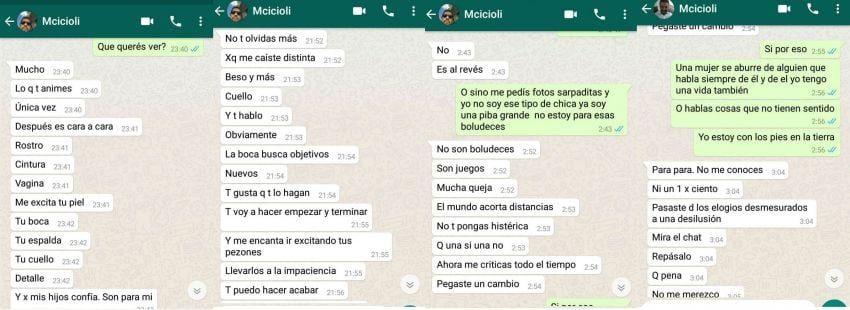 Según el relato de la modelo, Ciccioli habló de él, de su programa y luego se desubicó: "Me decía 'No te conozco, mandame una foto'. Yo le contestaba que ya tenía fotos mías en Instagram, pero él quería una 'sin producción'. Le mandé una foto con mi perro y me dice 'Yo quiero una foto que se vea más'".