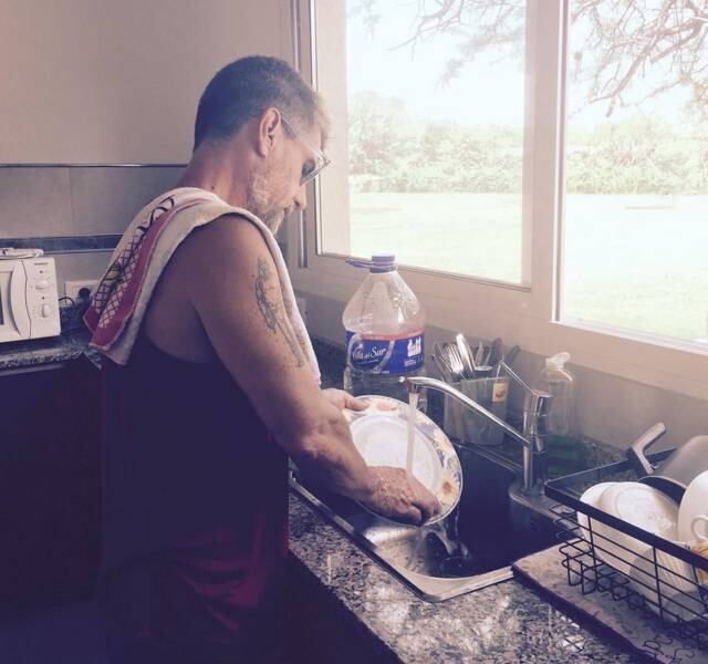 En este contexto, el Chato aprovechó un descuido de ella, le sacó una foto y la compartió. En ésta se ve cómo Lourdes barre el piso con una microbikini. Ella hizo lo suyo y lo captó lavando los platos.