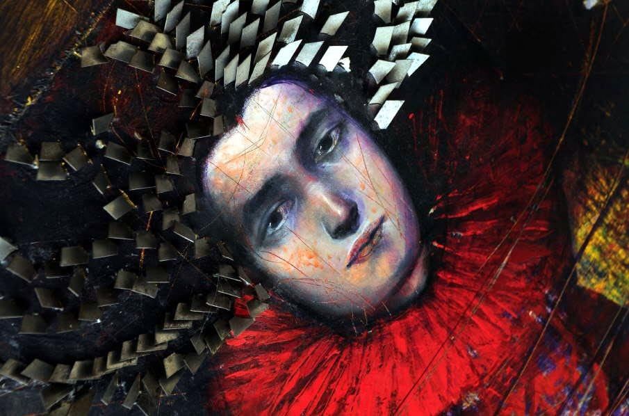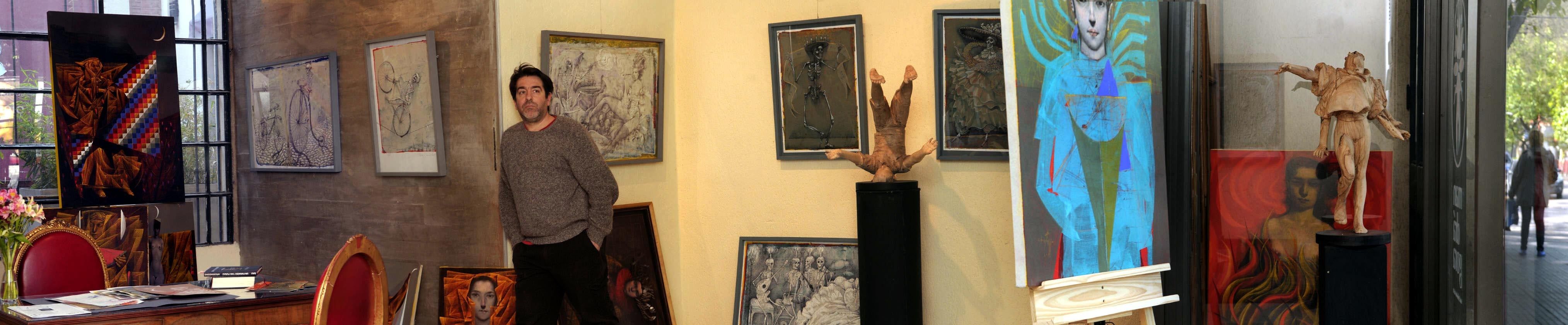 Su colección. "Títeres en su casa", es una de las pinturas que forman parte de su colección personal. Aquí intenta recrear la técnica encáustica, utilizada por los griegos y romanos, de la que no quedan registros. El resto de las cuchillas apiladas en su taller, las ultilizó para crear textura en esta figura. "Con la pintura no pretendo contar nada, solo que sea una imagen, que haya figuración, pero que no cuente nada".