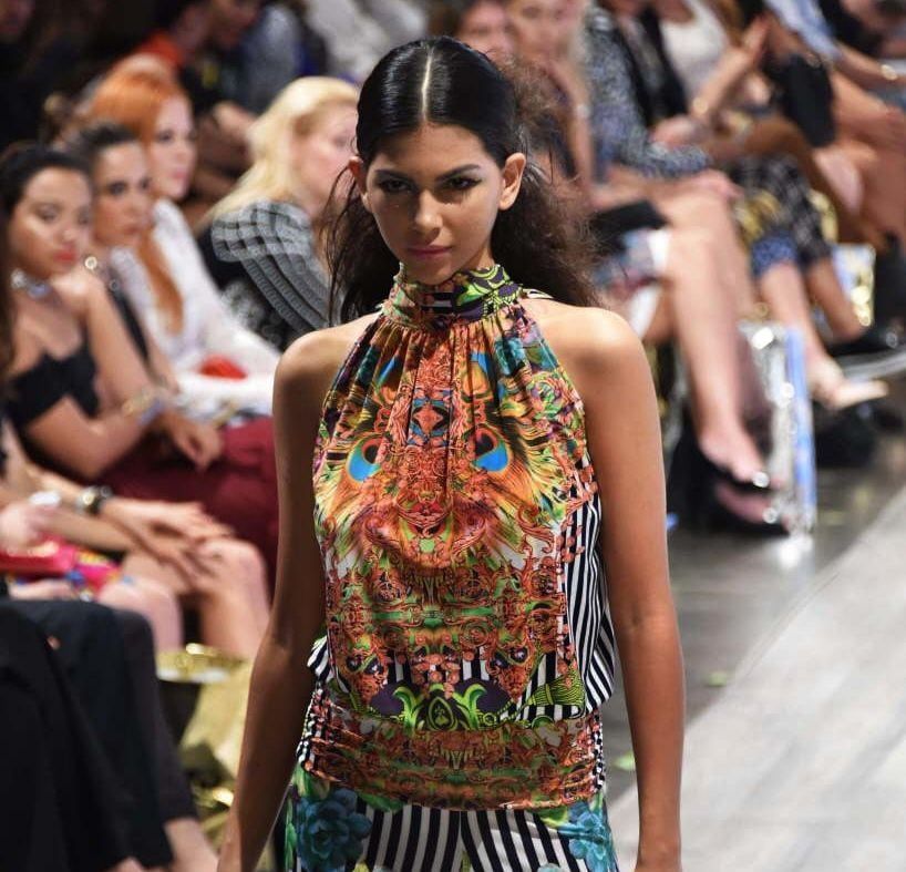 Sus diseños mostraron una especial y explosiva variedad de looks en donde la preeminencia del color, y el mix de estampas fueron parte de outfits híper llamativos. Así pudieron disfrutarse de estupendas maxifaldas que se pasearon con fluidez por pasarela, como también diseños de pantalones amplios, con blusones asimétricos, blusas de escotes holter, y tops cortos.