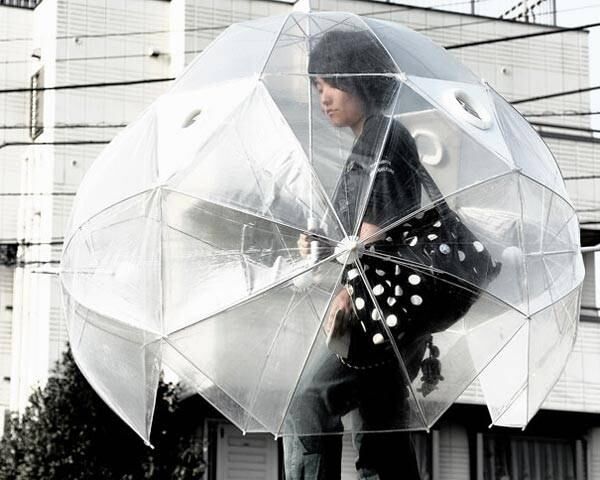 Paraguas-burbuja: Protege del todo de la lluvia, pero no sabemos si es muy funcional... sobretodo si tenés que andar por una ciudad con más gente alrededor. Y no te digo si tenés que entrar en un shopping.