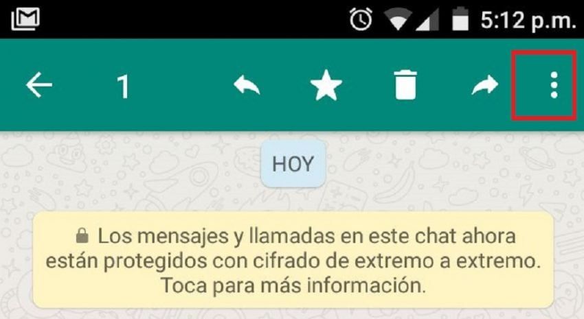 Paso 2: presionar sobre el mensaje hasta que aparezca el menú superior que sirve para responder, reenviar, borrar. En el margen superior derecho figuran tres puntos ordenados verticalmente.