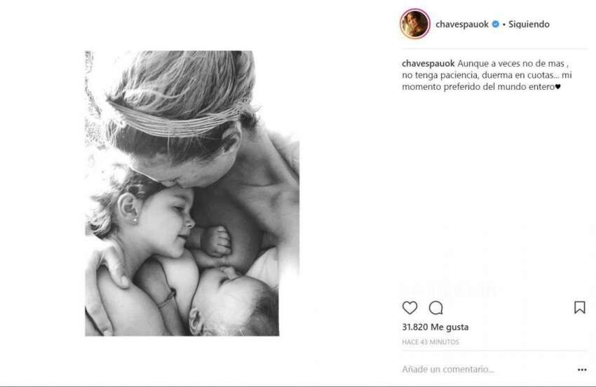 Se puede ver en forma de instantánea a Paula dando de mamar al pequeño Baltazar, mientras a su vez abraza a Olivia, con una frase muy especial y común entre muchas mamás que sienten lo mismo: “Aunque a veces no dé más, no tenga paciencia,duerma en cuotas... mi momento preferido del mundo entero”. Lo que se dice una postal perfecta y amorosa.