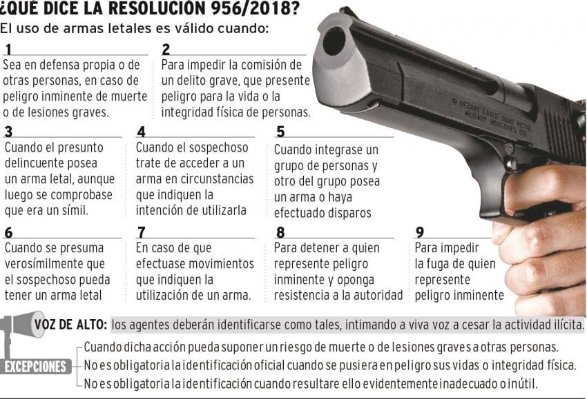 El uso letal de la fuerza contempla, tanto en la normativa local como en la resolución nacional, que el agente pueda disparar si se enfrenta a un sujeto armado, aunque esgrima una réplica de arma de fuego y ello se constate después. "En ese caso el efectivo debe priorizar su integridad y la de terceras personas, aun entendiendo que esa arma no es una réplica si el peligro es inminente e inevitable", lanzó Munives.