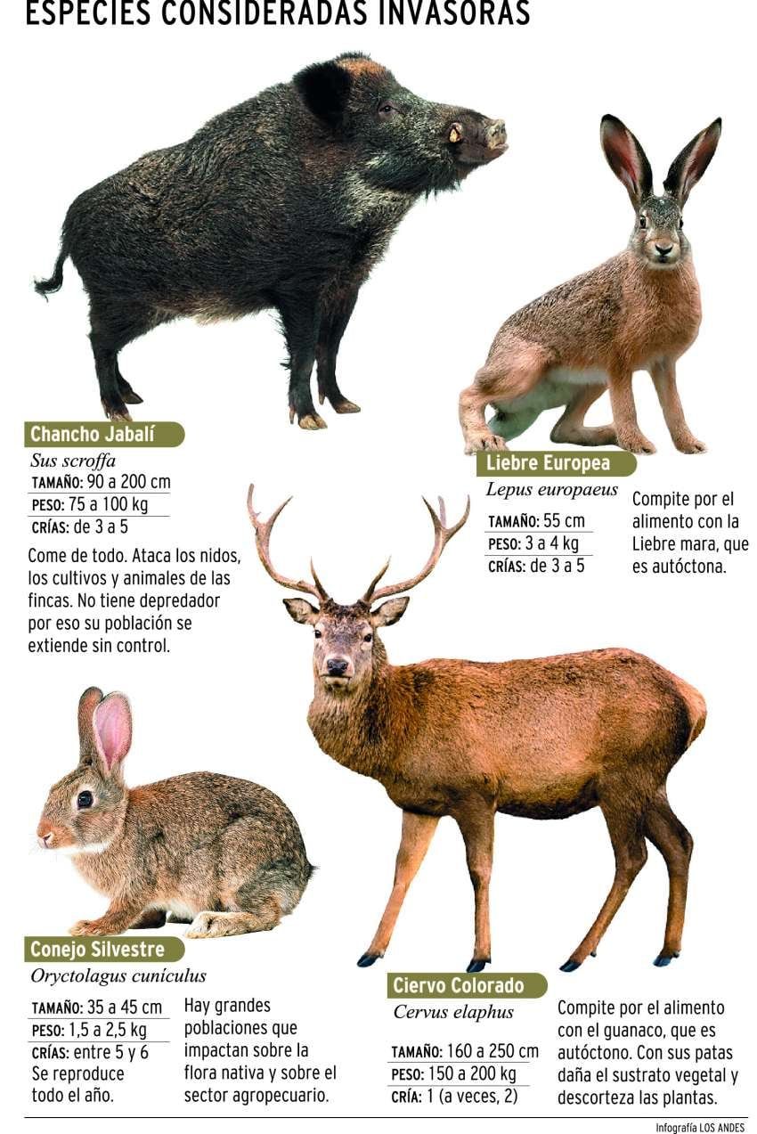 Se trata del conejo silvestre, el chancho jabalí, la liebre europea y el ciervo colorado.