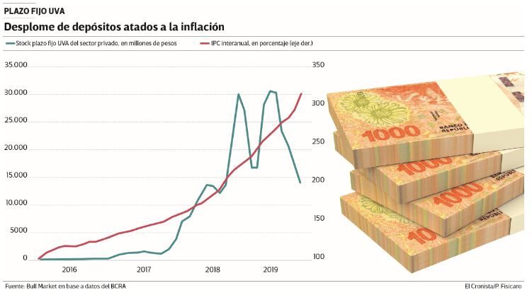 En febrero último, luego de un dato de inflación de enero mayor al esperado, el stock de estos depósitos pasó de menos de $ 14.000 millones a superar los $ 30.000 millones dos meses más tarde, tanto por el efecto sobre el capital del mayor ritmo de la inflación como por nuevas colocaciones. Lo mismo se vio en octubre 2018, después de números altos de IPC. Pero la falta de confianza en el peso no permitió que en esta ocasión el comportamiento se repitiera.