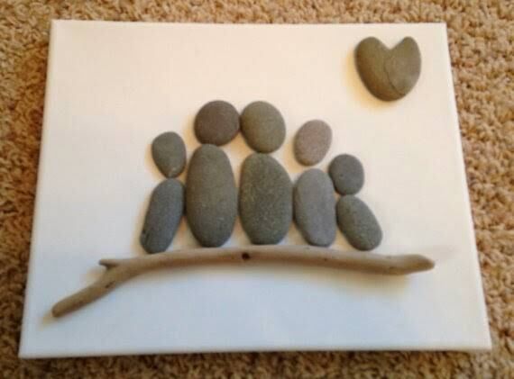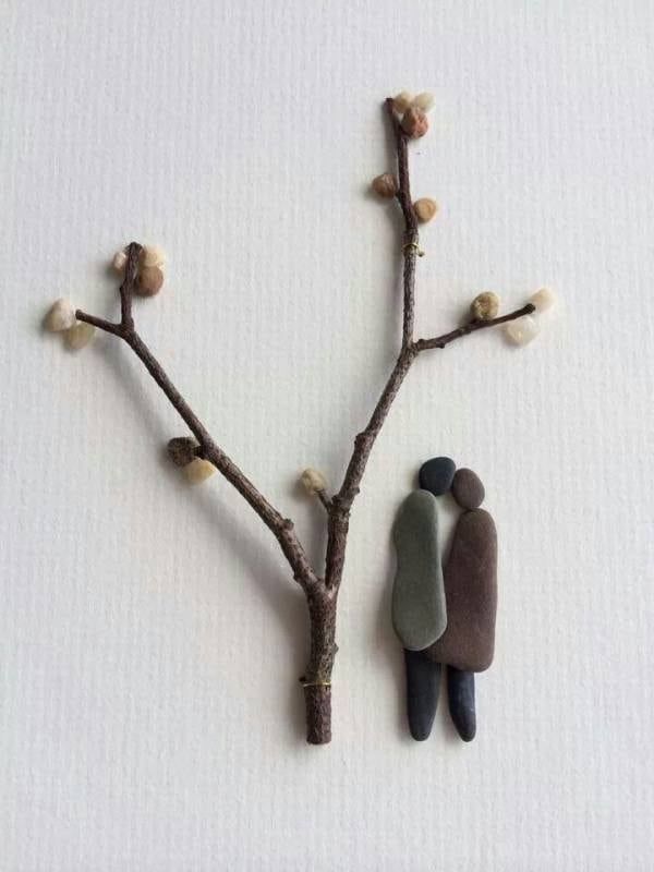 UN GRUPO DE PERSONAS Y HASTA UN CORAZÓN, TODO HECHO EN PIEDRAS COMBINADAS CON UNA MADERA, FANTÁSTICO