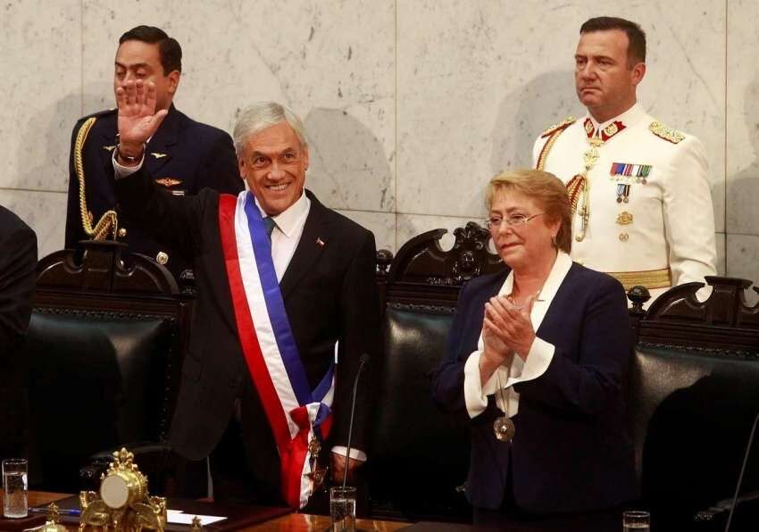 Luego del juramento de rigor, la presidenta saliente, Michelle Bachelet, le entregó la banda presidencial a Carlos Montes, quien procedió a colocársela a Piñera.