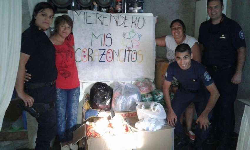 Policías de la comisaría 49 llevaron ropa, zapatillas y alimentos al merendero "Mi Corazoncito" de Palmira. Los efectivos trabajaron en conjunto con algunos de los comercios de la zona.