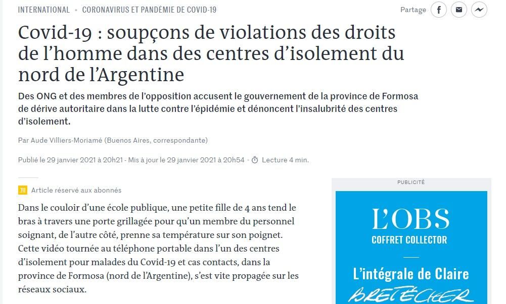 El diario francés también visibilizó que, al contrario de lo que sucede en gran parte del mundo, “los habitantes de la provincia no pueden aislarse en sus casas, un caso único en este país federal de 23 provincias. En estos centros se encuentran actualmente alojados algo más de 2.000 personas, según cifras oficiales”.