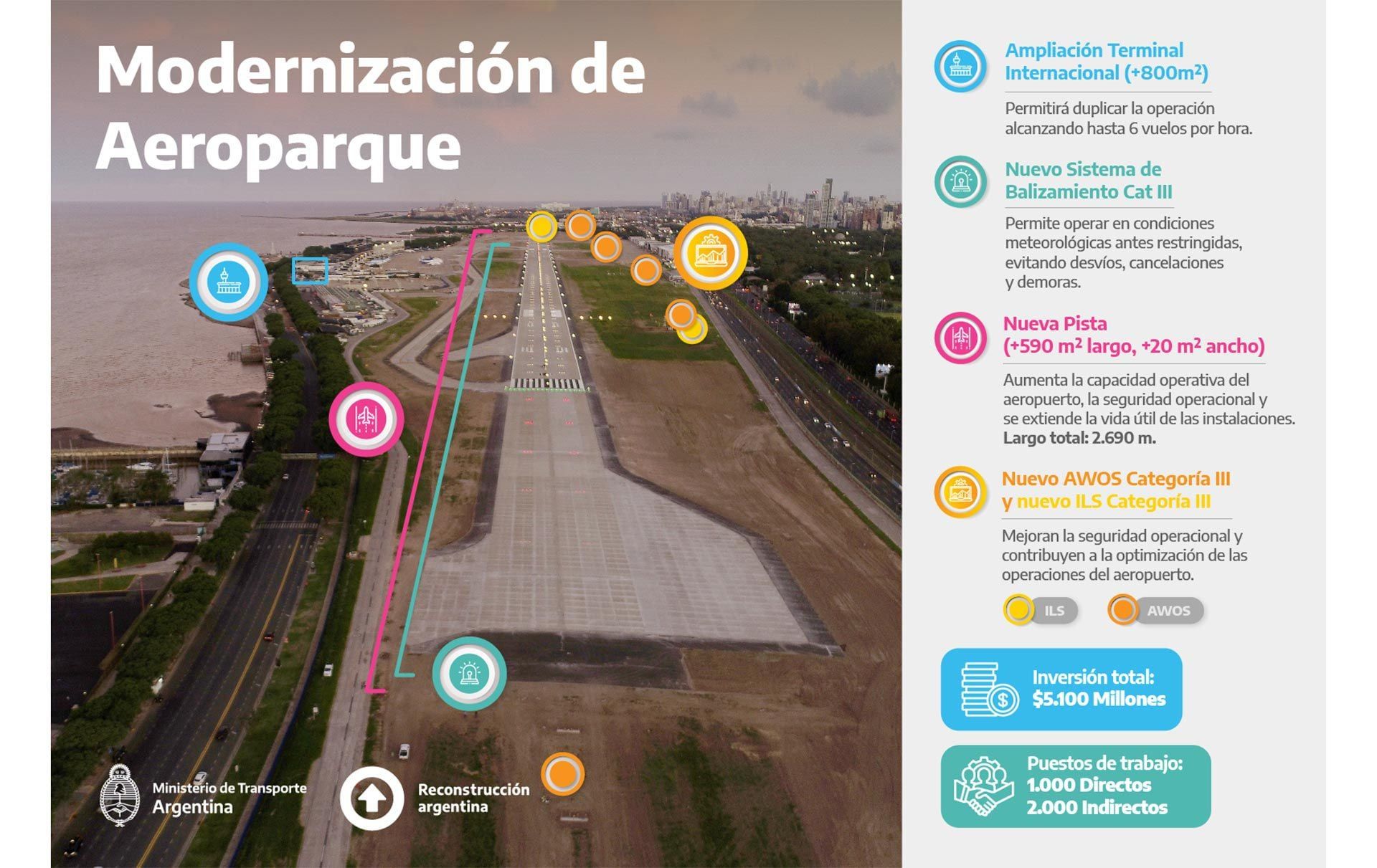 Las obras de modernización de Aeroparque, llevadas adelante por el Ministerio de Transporte de la Nación como parte del Plan de Modernización del Transporte Aéreo, abarcaron la construcción de una nueva pista que incrementa los márgenes de seguridad y permite la operatividad de vuelos de mayor alcance.