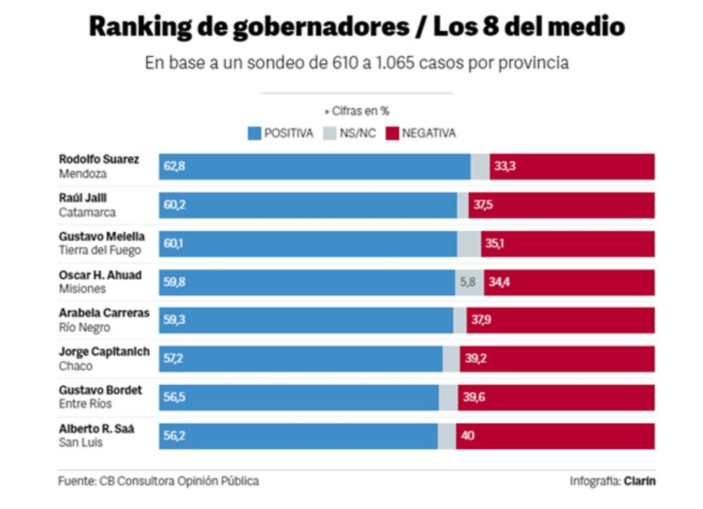En el bloque intermedio, ya con todos los gobernadores con más apoyos que rechazos, empieza a haber una mixtura mayor. Por caso, aparece el primer mandatario de Juntos por el Cambio. Se trata del mendocino radical Rodolfo Suarez, que supo ser líder del ranking y ahora ocupa un más que digno noveno puesto: combina 62,8% de positiva y 33,3% de negativa, cifras que envidiaría cualquier candidato presidencial.