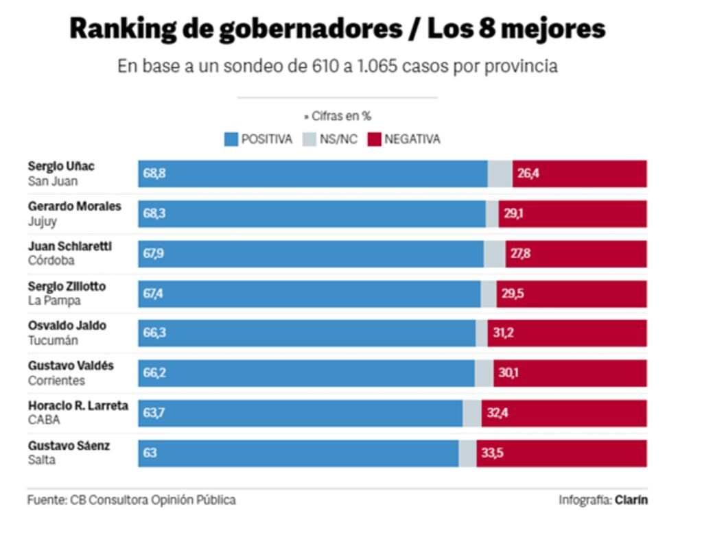 El sondeo mensual que hace CB consultora opinión pública dirigida por Cristian Buttlé ubica al gobernador de San Juan, Sergio Uñac, primero en el ranking de este mes con casi un 70% de imagen positiva, seguido de Gerardo Morales de Jujuy (68,3) y Juan Schiaretti de Córdoba (67,9%).